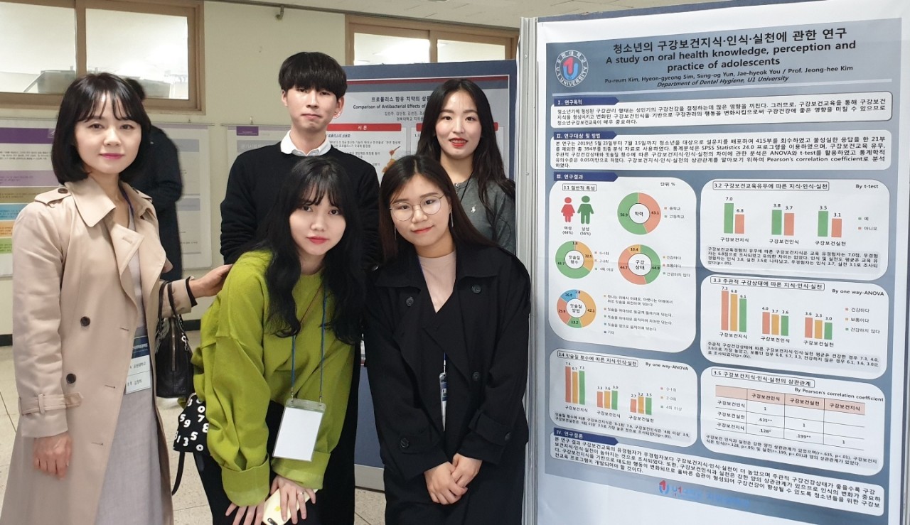 지난 11월 2일(토) 3,4학년 학생들은 ‘2019 한국치위생학회 종합학술대회'에 참석 하였습니다. 우리학교는 이번 학술대회 학생 포스터 경진대회에 4학년 5개 팀이 참여하여 ‘장애인 구강보건교육 자료에 대한 실태조사’라는 주제로 '김주희, 김희연, 정예연, 지도현'(지도교수 유자혜) 팀이 대상을 수상하였으며, 이외에도 '이혜진, 연혜선, 채승희(지도교수 이민영)', '박지현, 이우정, 전수진'(지도교수 김정희) 팀이 장려상을 수상하는 좋은 결과를 얻었습니다. 이에 대상을 수상한 우리학교는 학생 포스터 경진대회에 참여한 전국의 치위생학과 약 40여개팀을 대표하여 구연발표를 하였습니다. 우리학교 치위생학과가 앞으로도 꾸준히 치위생학 발전에 기여하며 학교를 빛내기를 바랍니다^^