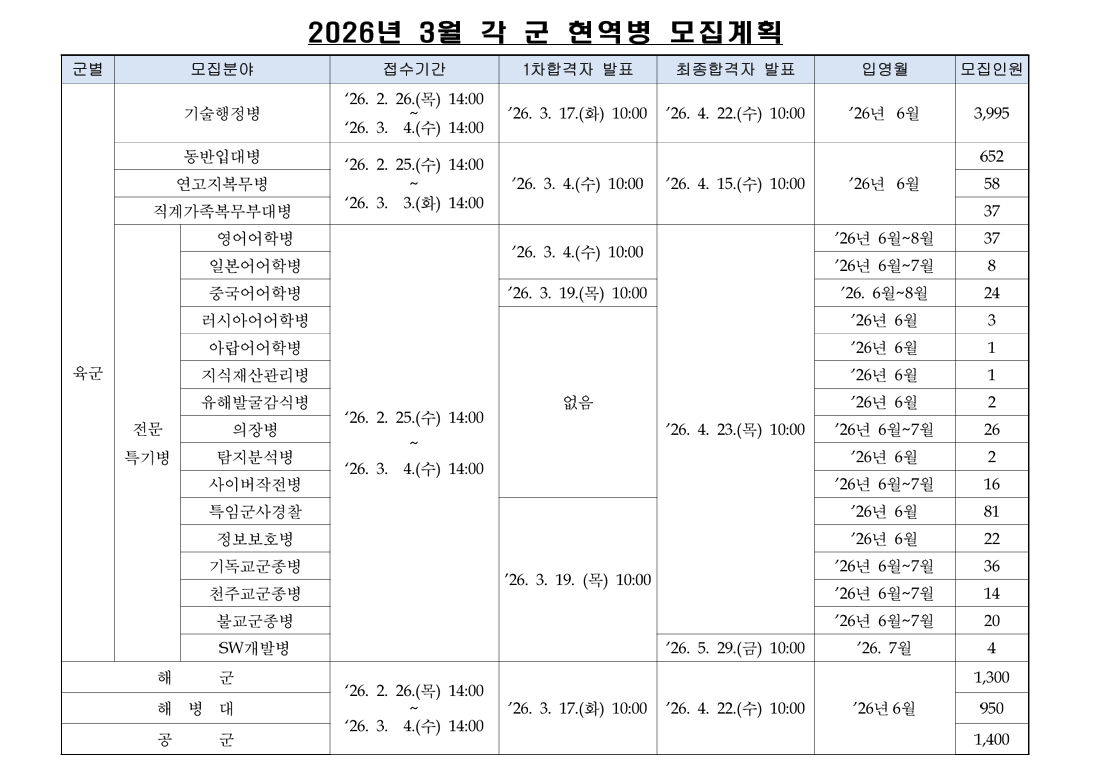2026년 3월 각 군 현역병 모집일정